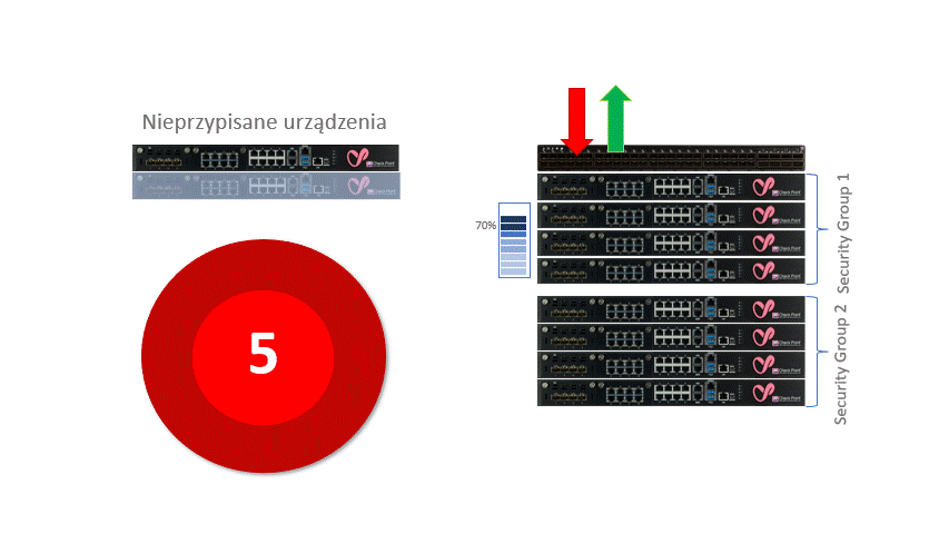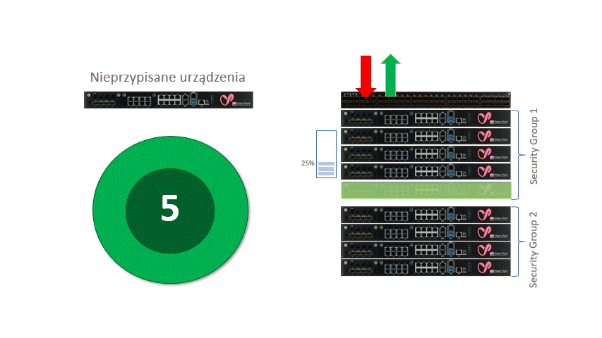 Wszystkie urządzenia podłączone do Maestro wchodzące w skład takiej Security Groupy są urządzeniami Active, a zatem uczestniczą w ruchu sieciowym i zapewnieniu bezpieczeństwa.