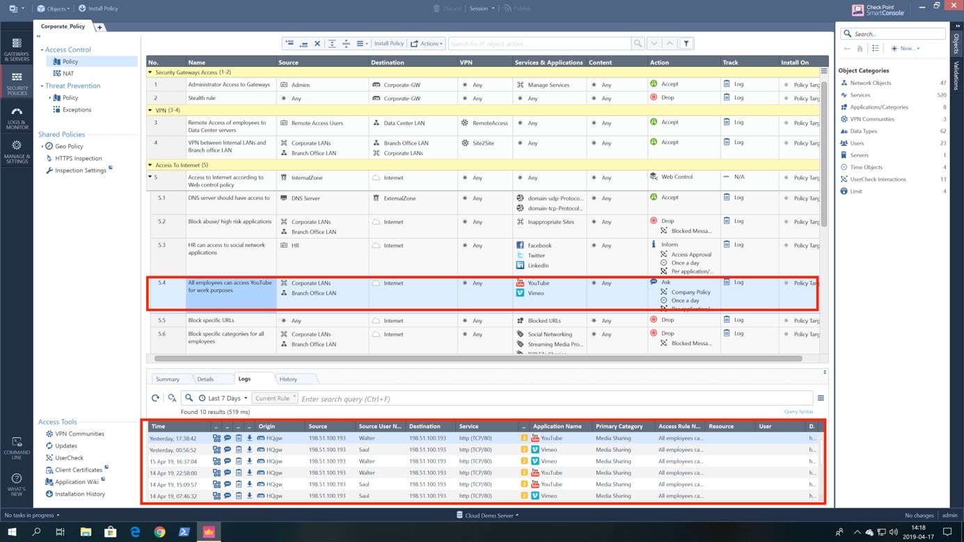Nowy system logów jest bardzo interaktywny. Pozwala m.in. na dodawanie nowych obiektów na podstawie informacji dostępnych w szczegółach połączenia lub na dodawanie wyjątków do reguł bezpieczeństwa na podstawie informacji zawartych w karcie konkretnego zdarzenia. Informacje o ruchu wpadającym w daną regułę również możemy uzyskać na kilka sposobów. Jednym z nich jest po prostu kliknięcie w regułę, która nas interesuje. W dolnej części interfejsu momentalnie otrzymamy widok ruchu, który wpada w zaznaczoną regułę.
