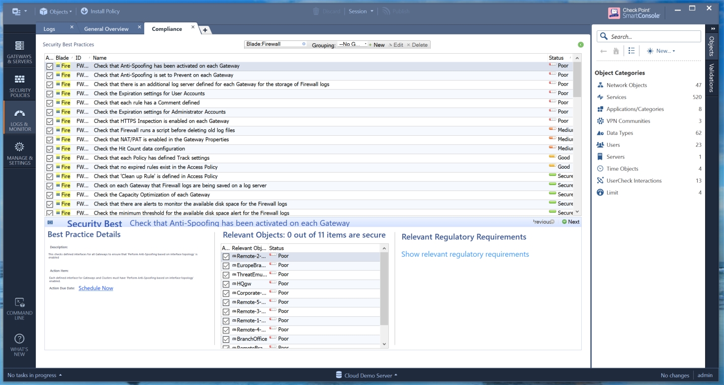 W najnowszym systemie do analizy zdarzeń nie zabrakło oczywiście bardzo lubianego przez administratorów systemów Check Point modułu Compliance. Konfrontuje on bieżącą politykę bezpieczeństwa z bardzo dużą bazą najlepszych praktyk, dzięki czemu administrator może szybko zweryfikować, które elementy konfiguracji mogą wymagać poprawek. Dzięki Compliance blade możemy również zweryfikować jak nasza polityka bezpieczeństwa wpisuje się w normy nakreślone np. przez ISO, PCIDSS czy NIST. Jest to doskonałe narzędzie do monitorowania polityk bezpieczeństwa w kontekście konfiguracji wymaganej przez RODO wiele dobrych praktyk dotyczy bowiem kwestii związanych z ochroną danych osobowych.
