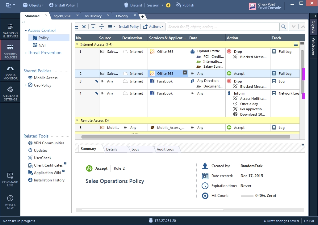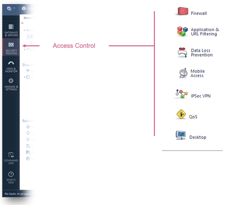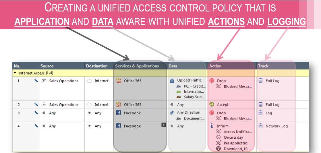 Nowy system zarządzania to nie tylko odświeżona konsola zarządzania, a wręcz przemodelowane podejście do tworzenia reguł, oraz budowania polityki bezpieczeństwa. Jednym z kluczowych elementów nowego systemy zarządzania jest sekcja - Access Contorl Policy. W której to w jednym miejscu mamy możlowiść kreowania regół dla modułów bezpieczeństwa takich jak: Firewall, Application Controll, URL Filtering, Data Awareness, Mobile access, IPSECVPN, QoS a oraz Desktop.
