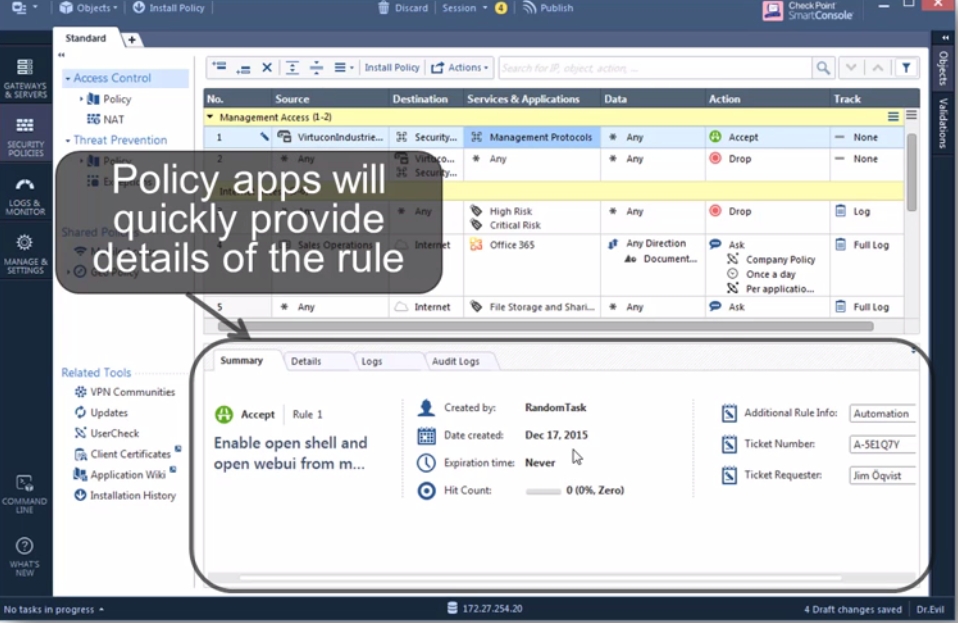 Po pierwszych lekcjach wprowadzających nas do nowości czekających w wersji R80.x w czwartej lekcji z cyklu "R80.x Training Videos" rozpoczynamy omawianie budowy polityk bezpieczeństwa w oparciu o nowe zunifikowane podejście.