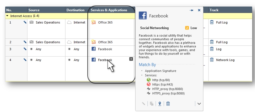 W obszarze kreowania reguł dla polityk Access control mamy nową kolumnę "Services & Applications", która umożliwia budowę reguł zarówno z wykorzystaniem kryterium opartym na serwisach (protokołach komunikacyjnych, portach) jak również bazując na aplikacjach. Dla każdej aplikacji mamy domyślnie wybrane rekomendowane serwisy, które możemy w razie potrzeby ręcznie zmienić.