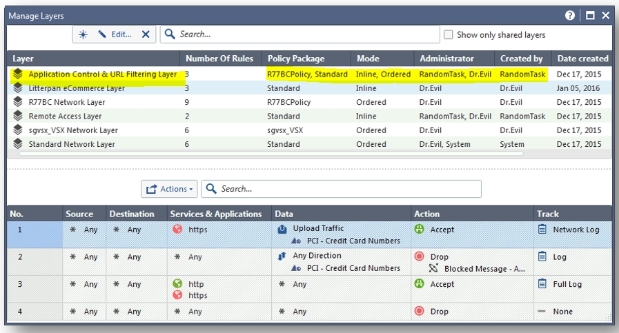 Raz zdefiniowane polityki warstwowe można użyć w wielu różnych paczkach polityk, jak również mogą być wykorzystane w różnych trybach. Tak na przykład warstwa "Application Control & URL Filtering Layer" jest użyta w polityce "R77BCPolicy" w trybie inline oraz w polityce "Standard" w trybie Ordered.