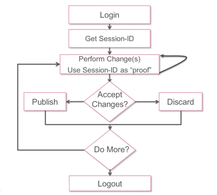 W trakcie pracy za pomocą REST API obowiązują nas te same zasady co w przypadku pracy z SmartConsolą. Na początek musimy się uwierzytelnić. Po uwierzytelnieniu otrzymamy numer identyfikacyjny sesji - wspomniany wcześniej parametr X-chkp-sid. Od tego momentu możemy dokonywać zmian. Pamiętajmy, że identyfikator sesji musi być podany przy każdym żądaniu Naniesione zamiany należy opublikować i ewentualnie zainstalować nową politykę. Po zakończeniu pracy możemy się wylogować.